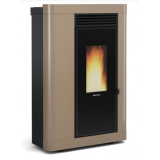 Der kleine extra flache belüftete Pelletofen Matilde 4,5 kW der Marke EVA CALOR ist ein kompakter Ofen, mit dessen 4 kW Sie Räume bis zu 100 m3 heizen können. Dank des Aufhängungssatzes, der hinteren oder seitlichen Evakuierung und seiner reduzierten Abmessungen gelingt es ihm, sich nach der Installation perfekt zu tarnen und sich an verschiedene Dekorationsstile anzupassen. Die im Pelletstank angeordneten Holzpellets dienen als Wärmequelle. Diese ermöglichen Ihnen eine effiziente Beheizung eines Wohnraums dank langsamerer Verbrennung. Dieser belüftete Pelletofen reduziert den Energieverbrauch und verspricht gleichzeitig langanhaltende und angenehme Wärme. Die Belüftung ermöglicht ein schnelles Erreichen der gewünschten Temperatur, aber auch eine gleichmäßige Wärmeverteilung. Mit seinem extraflachen Design passt sich dieser Pelletofen besser an Ihre Einrichtung an. Auch schlanker Ofen oder auch Flurofen genannt, ermöglicht seine geringe Stellfläche die Installation in kleinen Räumen.